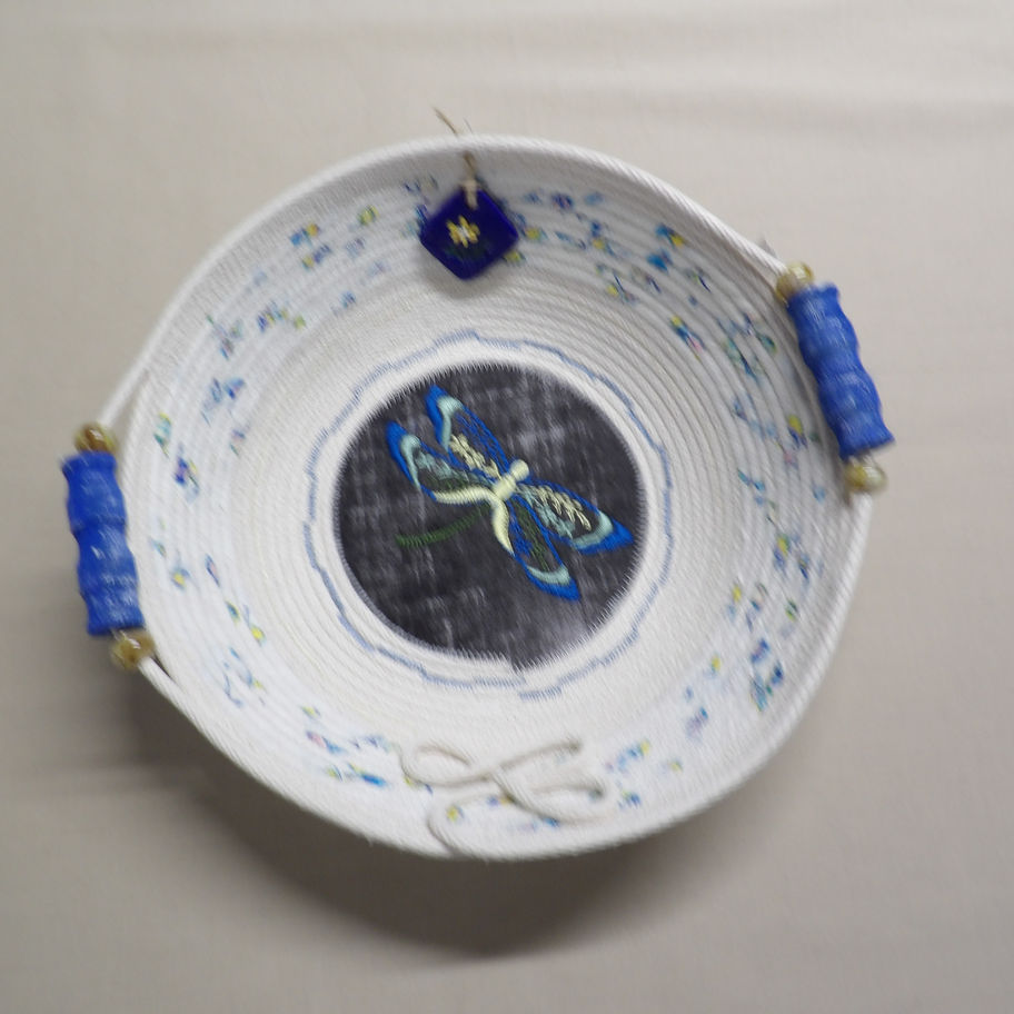 Large handmade Rope Basket- embroidered-Blue & yellow Dragonfly