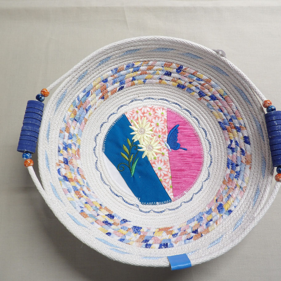 Large handmade Rope Basket- embroidered-Quilt Square w/ Dark Blue Butterfly & ye