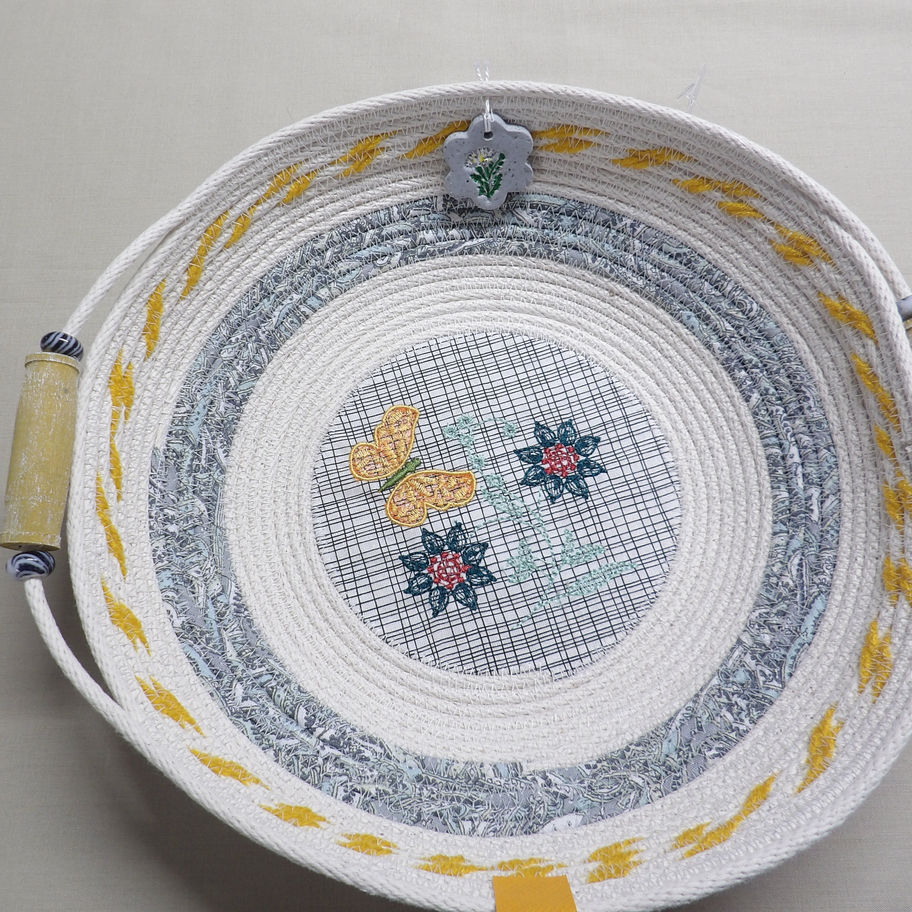 Large handmade Rope Basket- embroidered-Small Gold Butterfly and Flowers