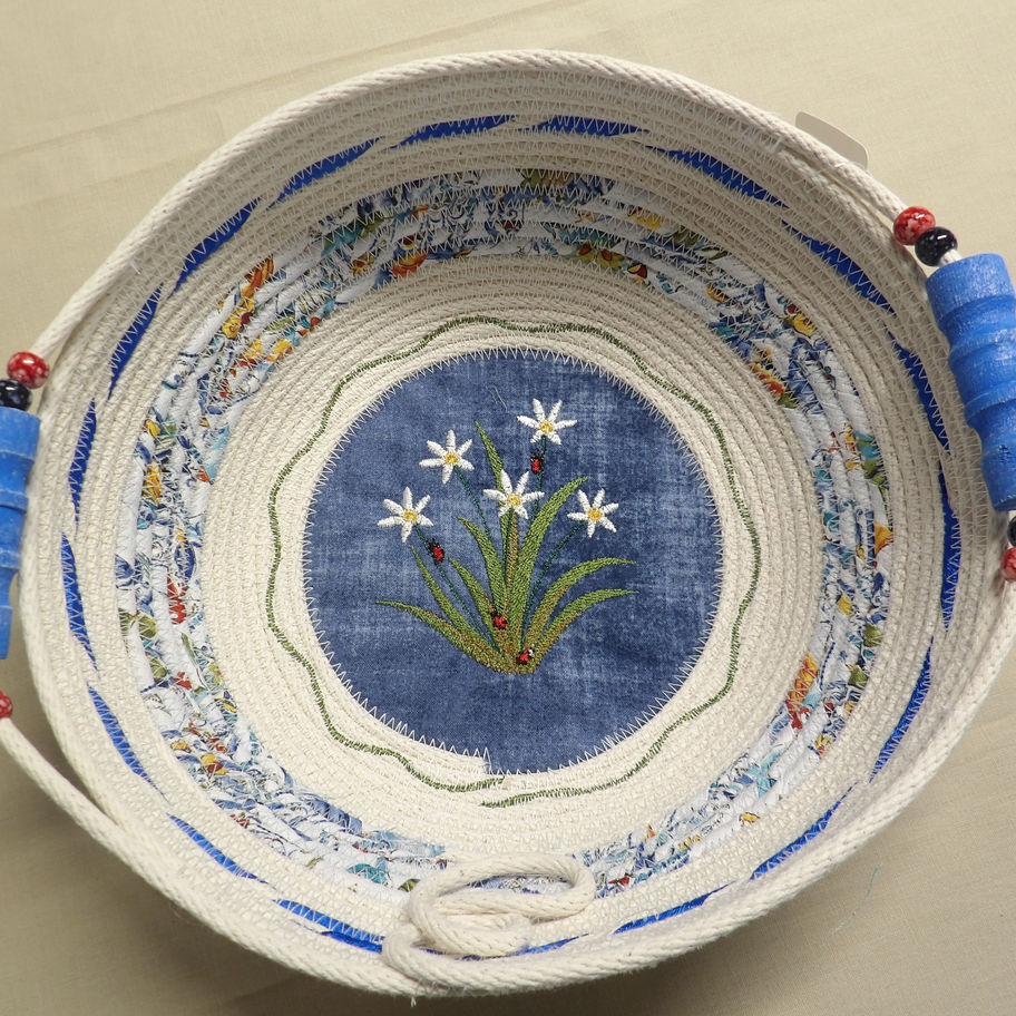 Large handmade Rope Basket- embroidered-White Daisies